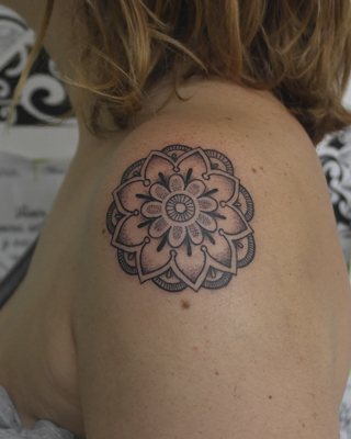 Tatuaje de un mandala pequeño en el hombro con sombras y puntillismo.