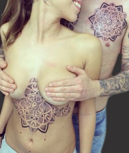 Tatuaje de un mandala debajo del pecho y adaptación en el pecho, sombreado.